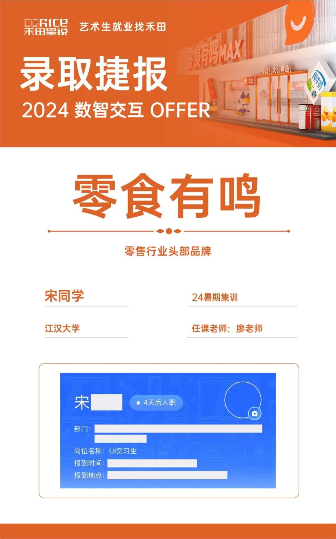 小涛的作品集中有一组偏向农产品零售方向的UI作品,与该零食零售公司所处的行业非常契合。这组作品让面试官眼前一亮,双方有了共同话题。“我在面试中重点展示了这组比较契合的作品,并介绍了自己的设计思路和方法论。例如,我会结合品牌调性去设计界面风格,也会站在用户第*感官的角度来考虑页面布局,让设计既符合品牌定位又友好易用。”面试官对此很感兴趣,追问了他在这组作品中运用了哪些特别的设计手法或设计思维。小涛坦诚分享了自己的想法,将平时在禾田课堂上老师所教的理念融会贯通,体现在作品设计中。比如,在UI设计时优先考虑用户最关注的信息摆放位置和视觉引导,以提升界面的第*眼体验。这种将理论应用于实践的讲解,证明了他对设计方法的消化和灵活运用。